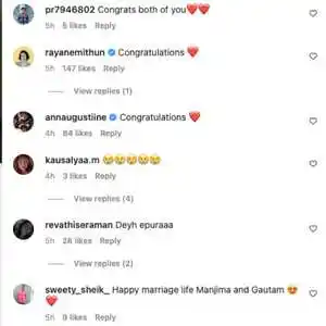 Many popular personalities congratulated the newly-wed couple via social media. Actress Keerthy Suresh wrote on Twitter, "I couldn't be happier for you Ammu! I wish I were there with you on your special day! Congratulations to you both @mohan_manjima @Gautham_Karthik God bless 🤗❤️". Harish Kalyan also posted on Twitter saying, "Wishing a lifetime of love and happiness to you both, Hearty congratulations dear @Gautham_Karthik & @mohan_manjima". Other celebrities like Shibani Dandekar wished the couple in the comments section.