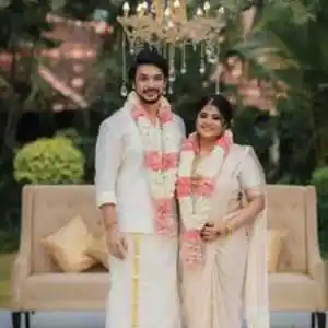 On their wedding day, Gautham Karthik looked dapper in his traditional attire, wearing a white shirt with a white mundu with a golden border, while Manjima wore an off-white saree with golden designs all over her saree.