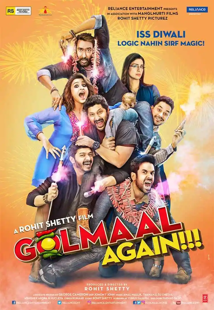 Golmaal is a Rohit Shetty-directed comedy film series that has four episodes so far. The first three were produced by Dhilin Mehta and the fourth by Shetty and Sangeeta Ahir. Three direct sequels—Golmaal Returns (2008) Golmaal 3 (2010) and Golmaal Again—to the 2006 film Golmaal: Fun Unlimited have since been released (2017). Shreyas Talpade Ashwini Kalsekar Murali Sharma Tusshar Kapoor Sanjay Mishra Vrajesh Hirjee and Mukesh Tiwari appeared in three of the four films while Kareena Kapoor and Kunal Khemu appeared in two of the four.