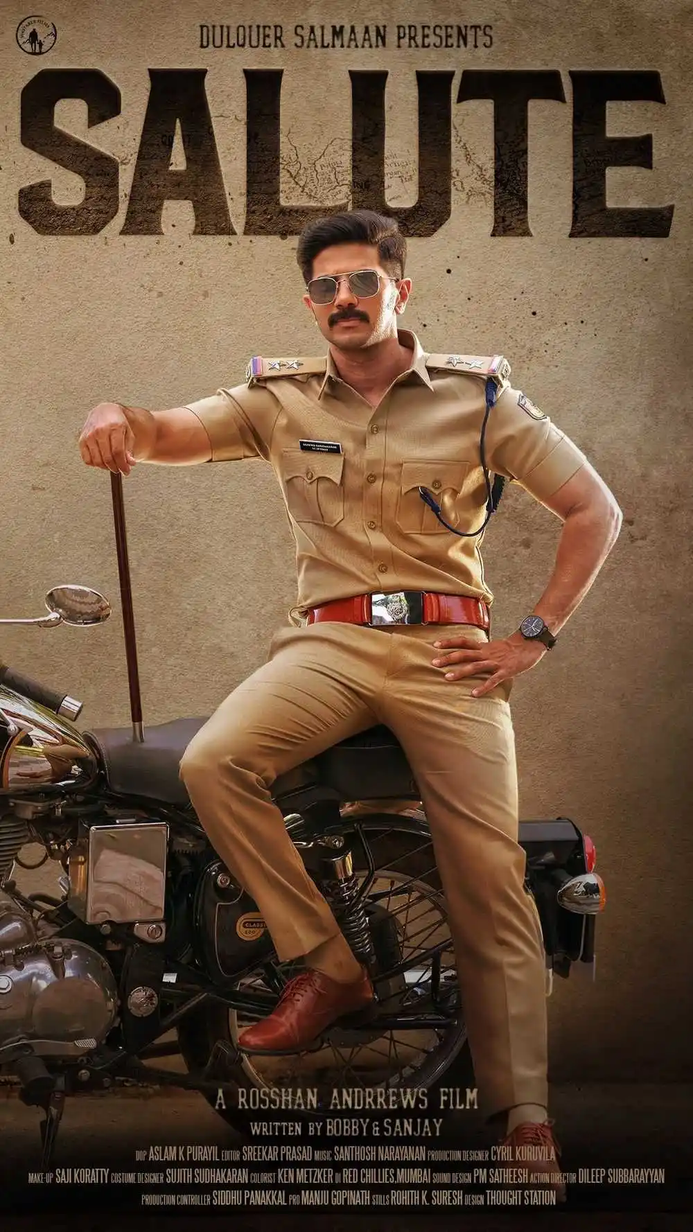 A police officer played by Dulquer Salmaan Salute is a 2022 Indian Malayalam-language crime thriller film directed by Rosshan Andrews and written by Bobby Sanjay. The movie was directed by Aslam K. Purayil edited by A. Sreekar Prasad and had Santhosh Narayanan on board to provide the initial background score before Jakes Bejoy took over. It was produced by Dulquer Salmaan under his banner Wayfarer Films. Malvika was portrayed by Saniya.