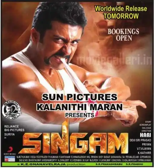In 2010 Hari wrote and directed the action movie Singam which was also produced by K. E. Gnanavel Raja under his Studio Green brand in collaboration with Reliance Big Pictures and released by Sun Pictures. It is his 25th film and features Suriya in the protagonist role along with Anushka Shetty Prakash Raj and Vivek in supporting parts. It is the opening chapter of the Singam series. The movie premiered on May 28, 2010.