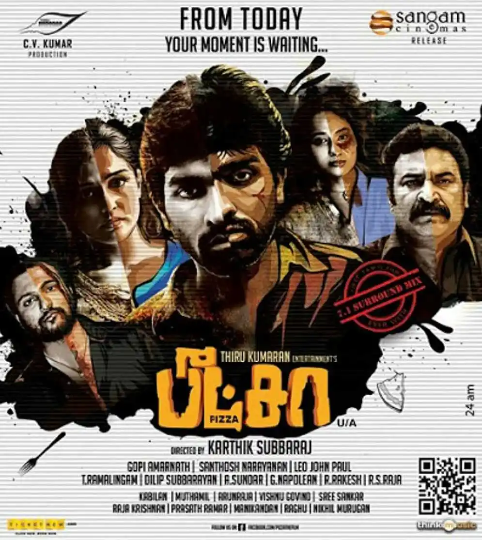 2012's Pizza is a Tamil-language horror film written and directed by Karthik Subbaraj a newcomer. Remya Nambeesan Aadukalam Naren Jayakumar Pooja Ramachandran and Bobby Simha play supporting roles alongside Vijay Sethupathi in the movie. Pizza was released on October 19 2012 and it quickly became a huge critical and financial success. Later Pizza was recreated as Whistle (2013) and Pizza in Hindi (2014). The Bengali movie Golpo Holeo Shotti was a remake of Pizza.